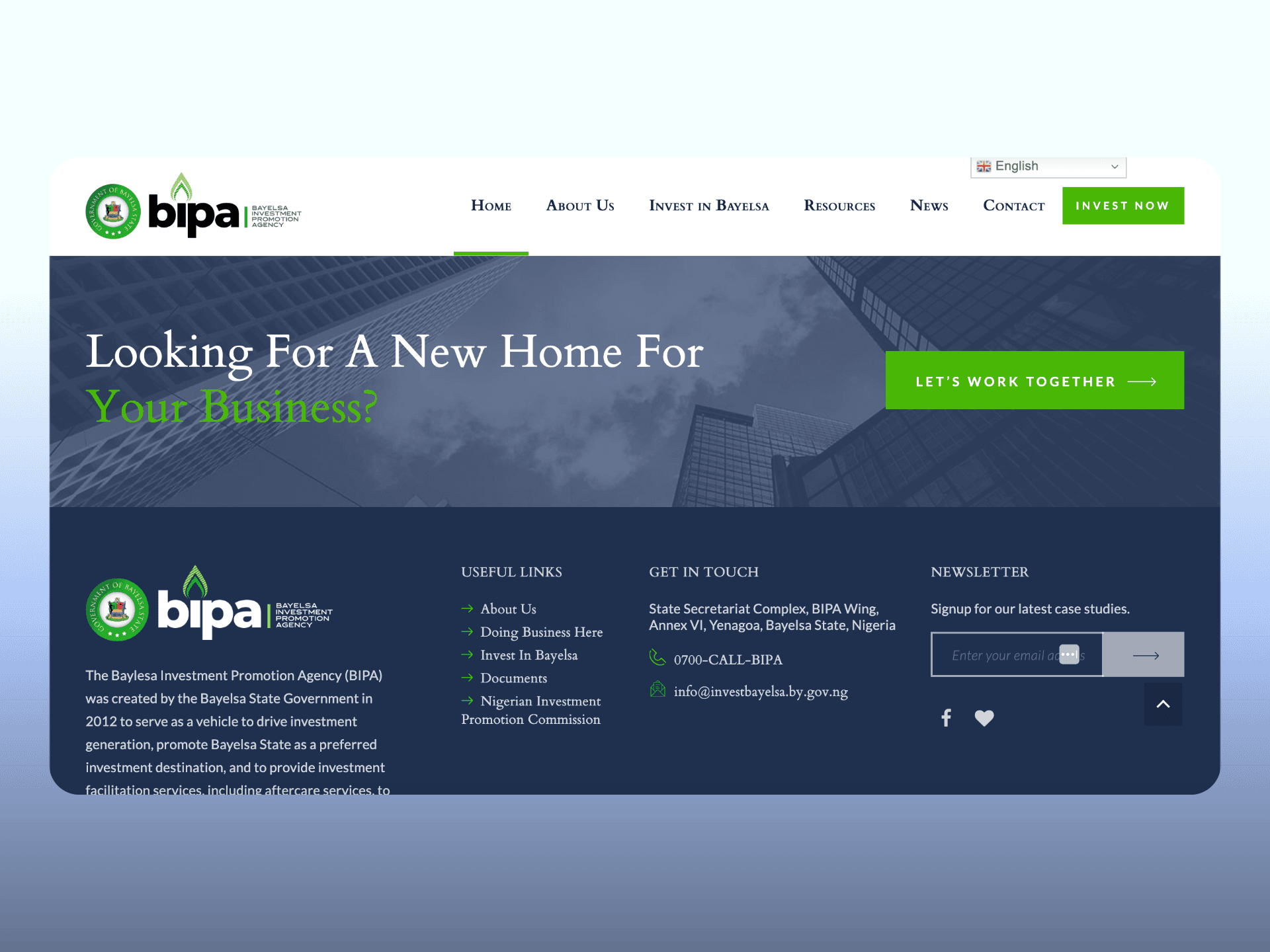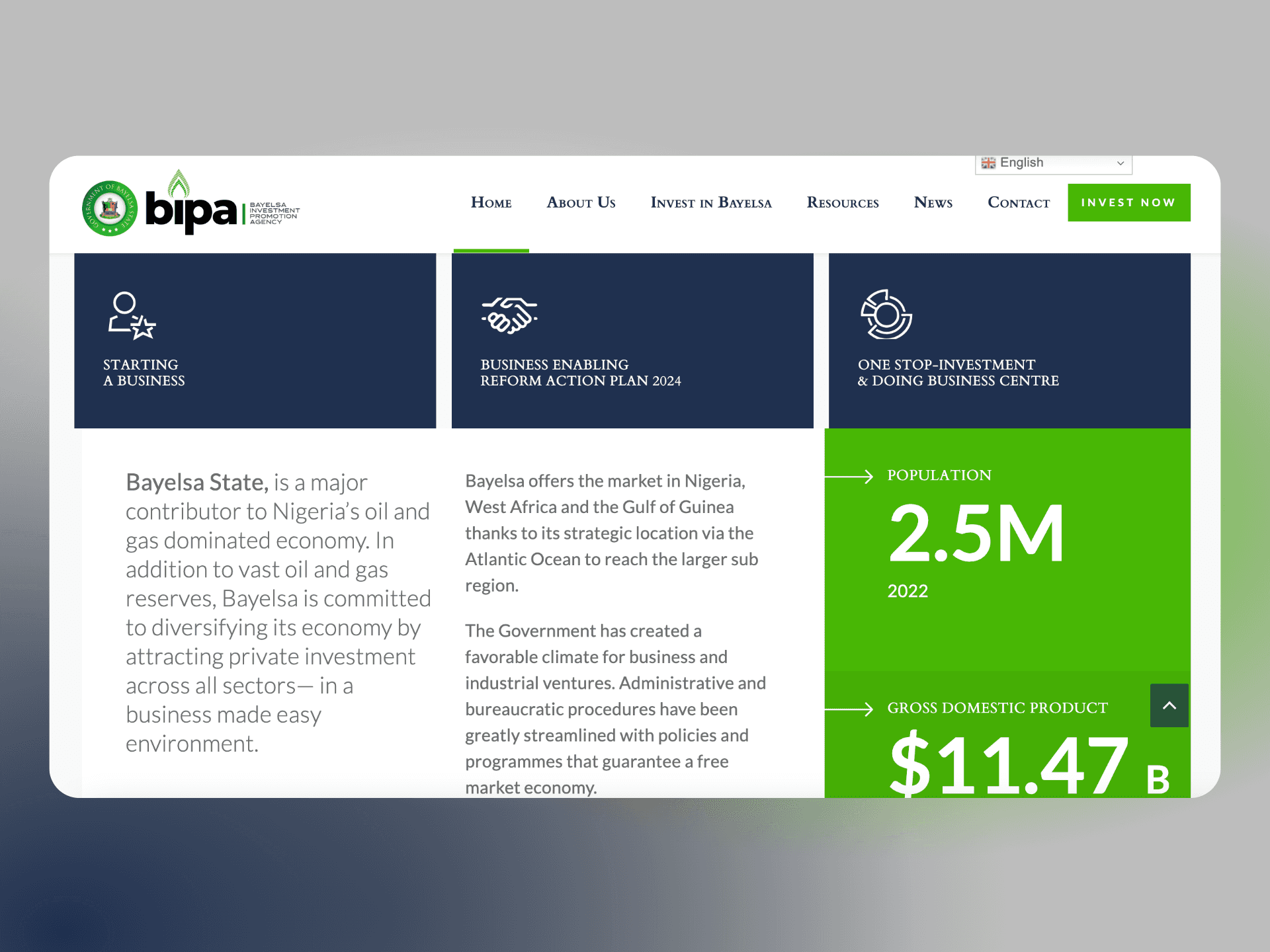 Design and develop a modern, professional website for Bayelsa Investment Promotion Agency (BIPA), showcasing investment opportunities in Bayelsa State, Nigeria. The website will serve as a virtual one-stop shop for potential investors, highlighting Bayelsa's business-friendly environment, economic advantages, and priority sectors.